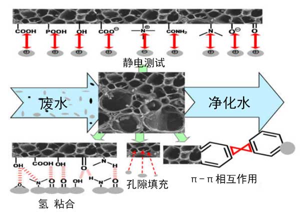 應(yīng)該注意的是,對(duì)活化過程的理解是優(yōu)化活性炭制備的基本步驟。實(shí)際上,各種化學(xué),物理和物理化學(xué)方法被用于從不同的天然或合成資源合成活性炭;瘜W(xué)處理涉及通過浸漬然后熱解使用活化劑,而物理過程涉及在蒸氣或二氧化碳存在下的高溫?zé)崽幚怼5牵@兩種方法的組合也已用于生產(chǎn)活性炭。根據(jù)所采用的處理方法,很難預(yù)測(cè)碳的物理化學(xué)和形態(tài)特性。看來形態(tài),物理化學(xué),質(zhì)地,通過改變活化時(shí)間和溫度以及所用前體的性質(zhì),活性炭的表面性質(zhì)會(huì)發(fā)生顯著變化;钚蕴勘砻娴幕瘜W(xué)性質(zhì)取決于存在于表面上的雜原子的類型,例如氧,氮,硫等。這些積累在表面上的雜原子或基團(tuán)要么來自原材料本身,要么在活化過程中被引入。這在很大程度上與前體的性質(zhì)有關(guān)。所有這些特性對(duì)于使用碳作為水溶液中污染物的吸附劑具有重要意義。實(shí)際上,污染物在活性炭上的吸附是一個(gè)復(fù)雜的過程,在涉及物理作用和/或化學(xué)鍵的過程中,各種相互作用可以共存。從而,可能發(fā)生的吸附機(jī)理為靜電相互作用,氫鍵,π-π堆積相互作用,孔填充,疏水相互作用,離子交換以及其他相互作用(n-π相互作用等)和絡(luò)合反應(yīng)。圖2說明了在活性炭上吸附污染物的主要相互作用方法。