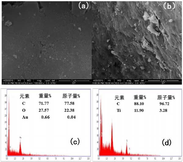 活性炭載二氧化鈦是通過溶膠-凝膠法合成的。在室溫下,將待載溶解在無水乙醇中,然后將冰醋酸緩慢加入漿液中。用濃鹽酸將溶液的pH值調(diào)至2-3。隨后,懸浮液在室溫下攪拌30分鐘并超聲10分鐘得到改性活性炭。SEM圖像及其對(duì)活性炭和載二氧化鈦活性炭的EDX分析如圖1所示?梢郧宄乜吹交钚蕴烤哂胁灰(guī)則的多孔結(jié)構(gòu),分布密度高。EDX上的元素映射表明C、O和Au的百分比分別為77.77%、27.57%和0.66%。應(yīng)該注意的是,Au主要來自用于增強(qiáng)導(dǎo)電性的鍍金膜。發(fā)現(xiàn)二氧化鈦顆粒分散在活性炭的表面。此外,在載二氧化鈦的活性炭上可觀察到粗糙的多孔結(jié)構(gòu),證實(shí)了二氧化鈦在活性炭表面形成。
