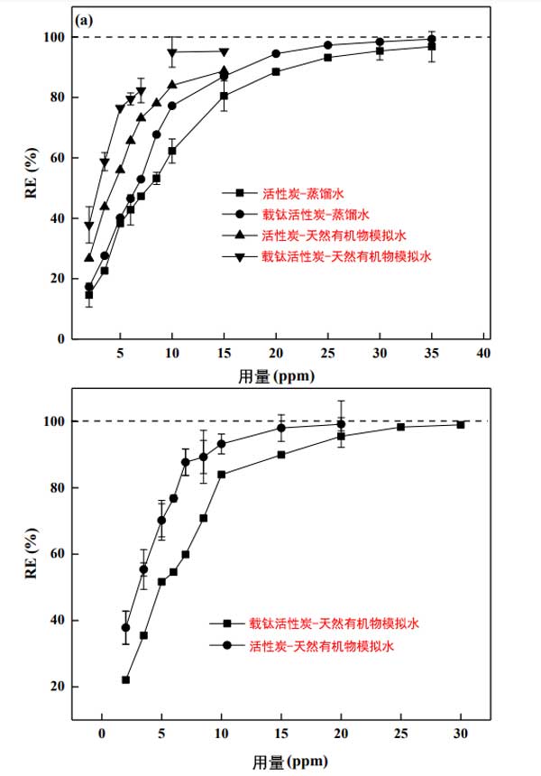 天然有機(jī)物的主要成分是腐植酸和單寧酸,因?yàn)樗鼈兤毡榇嬖谟诟鞣N天然水中。圖3顯示了從蒸餾水和天然有機(jī)物水中消除2-甲基異冰片的情況,這取決于光降解前后催化劑的用量。如圖3a所示,發(fā)現(xiàn)兩種催化劑在天然有機(jī)物水中的去除更接近。然而,腐植酸和單寧酸的存在導(dǎo)致活性炭和載鈦活性炭對(duì)2-甲基異冰片的吸附能力顯著降低。此外,為了達(dá)到氣味閾值濃度值,兩種催化劑在低天然有機(jī)物濃度的水中所需的劑量比在蒸餾水中增加了大約一倍。這種現(xiàn)象表明天然有機(jī)物和2-甲基異冰片之間對(duì)于兩種催化劑的活性位點(diǎn)存在競爭關(guān)系。同時(shí),值得注意的是,當(dāng)微生物分子接近模型污染物時(shí),競爭吸附最強(qiáng)。然而,在光降解后,載鈦活性炭對(duì)2-甲基異冰片的去除效率顯著提高(圖3b)。