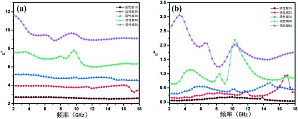 圖3:(a)載鉬活性炭-石蠟復(fù)合材料的相對復(fù)介電常數(shù)的實部和虛部,填充量從10%到50%不等。
