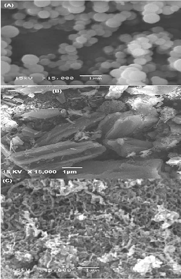 這種方法是檢查活性炭表面形態(tài)的有用方法。圖1A和1B展示了丙烯腈-共聚苯乙烯(A)和活性炭浸漬后的(B)SEM照片。這些圖顯示了球形、均勻形狀的結(jié)構(gòu),改性方法導(dǎo)致改性復(fù)合顆粒尺寸增加了7.95%。此外,圖1C顯示了制備的納米碳管的SEM圖片。該圖顯示了未處理樣品中存在無定形碳。此外,值得注意的是,這些管子又細(xì)又長,并且沒有大量凝聚在一起。納米碳管的管狀直徑介于75和99.25nm之間。