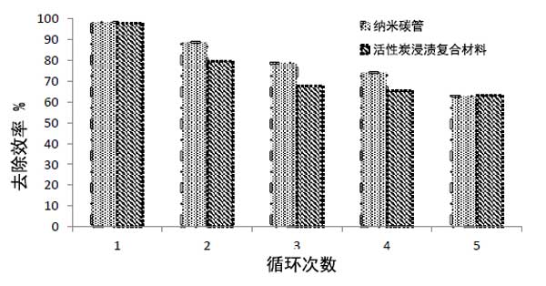 活性炭復(fù)合材料的再生具有經(jīng)濟(jì)重要性。該實(shí)驗(yàn)涉及許多吸附-解吸循環(huán),以估計(jì)重復(fù)脫色對納米材料吸附效率的影響。發(fā)現(xiàn)納米碳管和活性炭浸漬材料對活性紅的去除效率略有變化,如圖3所示。數(shù)據(jù)顯示原始納米碳管和活性炭浸漬材料存在差異與不同初始活性紅染料濃度下重復(fù)使用的納米化合物相比;钚约t的吸收程度在第一個循環(huán)后達(dá)到98.18%,然后在五輪納米碳管后降低到62.72%,而對于活性炭浸漬材料,第一個循環(huán)去除效率為97.72%,在第一個循環(huán)后,在五輪后降低到63.18%,表明其再生有效性,如圖3所示。因此,可以得出結(jié)論,納米碳管和活性炭浸漬材料的吸附過程會受到延長重復(fù)使用周期的影響,而不會損失大量染料吸附能力。因此,兩種納米化合物被多次用于從水性階段去除活性紅染料。因此,這表明它們可以多次使用,證明了它們的經(jīng)濟(jì)可行性。