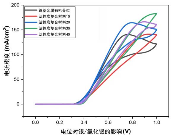 通過在KOH和CH3OH中氧化甲醇,使用循環(huán)伏安法測試活性炭復合材料的電化學性能。具有活性炭復合材料的鎳金屬對甲醇氧化反應表現(xiàn)出更高的催化活性(見圖2)。在鎳金屬改性玻璃碳電極的情況下,峰值電流密度沒有添加活性炭的高。具有更高濃度活性炭(40mg)的樣品顯示出高峰值電流密度。隨著活性炭量(60mg)的進一步增加,峰值電流密度降會稍微降低。綜上所述,建議將活性炭的濃度增加到一定限度可以提高電流密度。然而,增加活性炭的濃度也可能對催化活性產生不良后果。此外,活性炭復合材料的CV曲線具有不同的形狀和峰位置,這是因為合成時活性炭分散不完全,也由于其大量使用導致催化劑發(fā)生簇集,導致覆蓋金屬有機框架表面,從而阻礙活性催化位點在低電位下進行反應,從而在高電位下發(fā)生電荷轉移。
