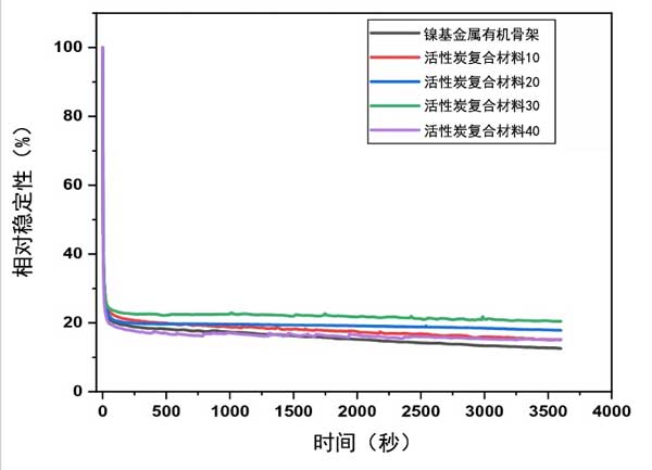 圖3:金屬框架及其復合活性炭在KOH和甲醇中的相對穩(wěn)定性曲線。