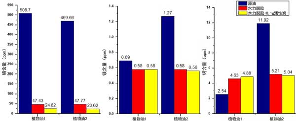 磷含量在兩個(gè)兩種植物油中主要由以所示的處理(水重量2%+活性炭0.1克)后減少圖2。植物油1的磷含量降低了大約95.22%,而植物油2的磷含量降低了大約相同的值(94.98%)。油液經(jīng)水脫膠后Mg、Ca含量略有下降,而Ca處理后略有升高。這一結(jié)果可能是由于在處理過(guò)程中活性炭中存在一些Ca解離回油相;钚蕴繉(duì)磷含量的大量降低是由于NaOH改性的活性炭具有極性、帶正電荷的表面。由于存在芳環(huán)簇和固有缺陷,它還具有磁力。在脫膠過(guò)程中將活性炭添加到植物油和水中時(shí),活性炭的芳環(huán)簇中的離域電子產(chǎn)生磁矩,強(qiáng)烈誘導(dǎo)磷脂磷酸頭部周圍的順磁性氧。同時(shí),活性炭的極性/親水性也允許與極性水分子相互作用。水分子也被磁場(chǎng)激活,從而發(fā)生氫自旋從旁水到鄰水的重新定向,從而降低水的抗磁性;钚蕴空T導(dǎo)的這種磁場(chǎng)會(huì)導(dǎo)致表面張力降低,削弱水分子的分子內(nèi)能。結(jié)果,更多的水分子被分解成H+離子和OH-離子,促進(jìn)更多水解反應(yīng)。這些現(xiàn)象與其他力量相結(jié)合:熱能和離心也會(huì)引發(fā)磷脂分子內(nèi)的鍵斷裂,導(dǎo)致磷酸頭部基團(tuán)從磷脂分子上分離(脫磷脂)。