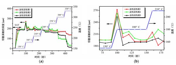 圖1:(a)催化試驗(yàn)期間下游鄰氯苯酚濃度的演變。(b)圖(a)150至210℃的局部放大率。