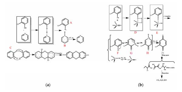 圖2:鄰氯苯酚氧化的反應(yīng)機(jī)制,包括(a)氨改性活性炭和(b)其他改性活性炭。