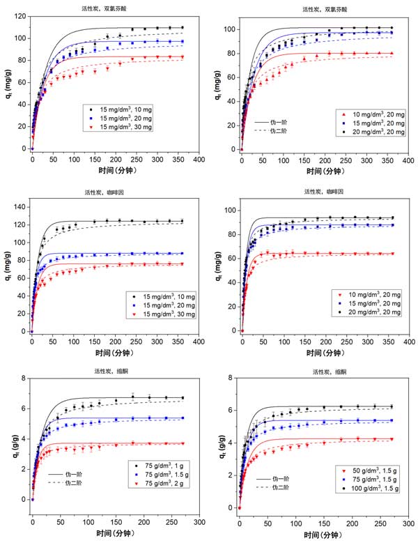 圖1:使用不同吸收濃度和活性炭用量對活性炭上雙氯芬酸、咖啡因和縮酮的動力學吸附數(shù)據(jù)。