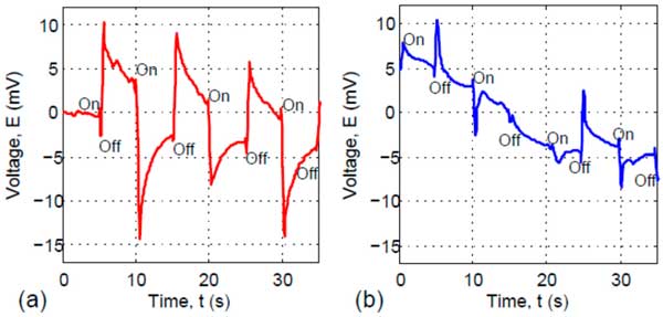 對含二氧化鈦的碳纖維復合材料進行了光敏性測試。熒光燈管用于產(chǎn)生可見光。電化學工作站用于記錄光子電壓響應數(shù)據(jù)。將復合碳纖維置于透明載玻片上,并使用鋁箔條形成導電路徑。將光源控制為“開”5秒,然后“關(guān)”5秒。得到的測試結(jié)果如圖2所示。曲線如圖2,發(fā)現(xiàn)該纖維樣品所具有半導體行為。當可見燈泡切換到“開”位置時,光照導致陽極產(chǎn)生電子,電壓變得更負。然而,當燈“關(guān)閉”時,發(fā)現(xiàn)電壓出現(xiàn)正浪涌,如圖2a所示。這種n型行為與在活性炭化纖維中添加鈷摻雜的鈦基氧化物顆粒有關(guān)。如果沒有鈷此外,光敏性是沒有那么強,如圖2陽極處的光子感應電壓不是那么穩(wěn)定,這也顯示在圖2b中,基線漂移較大。