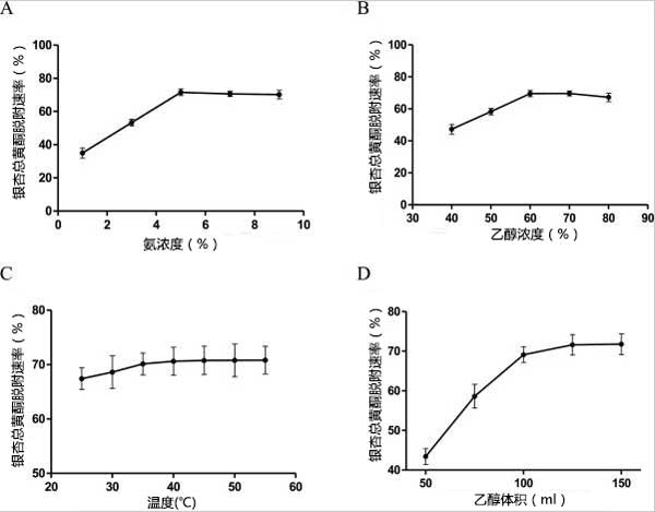 活性炭對銀杏葉中銀杏總黃酮的吸附主要依靠分子間范德華力的可逆吸附和表面酸性氧化物的不可逆吸附,兩者在吸附極性化合物方面均優(yōu)于非極性化合物。銀杏總黃酮的解吸方法主要有升溫解吸(沸水)、置換解吸(苯酚、氨水或CaCl2)和超聲波解吸。沸水對銀杏總黃酮的穩(wěn)定性影響很大,氨水的效果與幾種去污劑相比效果顯著。因此,本研究將通過單因素優(yōu)化相關因素。單因素優(yōu)化比較了三種拆分劑(苯酚、氨水或CaCl2)對活性炭中銀杏總黃酮拆分的影響,其中氨水的影響最為顯著。因此,我們比較了不同濃度氨對活性炭解析的洗脫速率,氨濃度在5%時達到最大值,超過5%后逐漸下降。由于黃酮類化合物的極性范圍較寬,在大約5%的氨-乙醇-水溶液中可以實現(xiàn)銀杏總黃酮的最大解吸率(71.2%)。