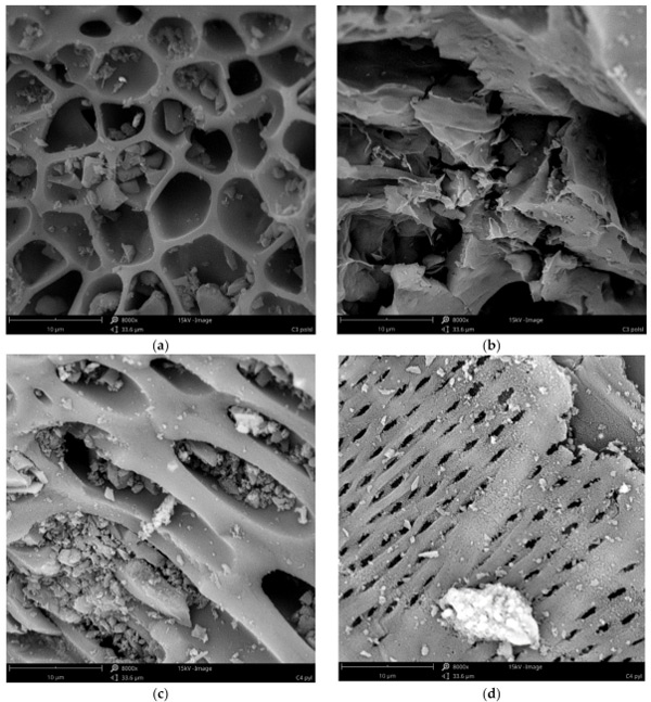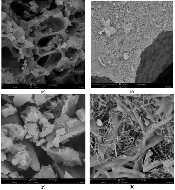 在溶劑加載之前的活性炭通過使用掃描電子顯微鏡作為SEM顯微照片進(jìn)行表征(圖1)。分析表明,不僅研究不同材質(zhì)活性炭彼此的不同,而且在一種材料中也可能出現(xiàn)不同的結(jié)構(gòu)(圖1a與圖1b、圖1c與圖1d、圖1e與圖1f和圖1g與圖1h)。所有的材料都不是均質(zhì)的,在所有的原材料中,都可以發(fā)現(xiàn)具有不同孔隙率的顆粒、壓實(shí)的塊狀,甚至是纖維結(jié)構(gòu)。材料C1(粒徑0.5÷0.75mm的活性炭)是高度多孔的,顆粒充滿可見孔,直徑為5÷11µm,壁光滑(圖1a),顆粒結(jié)構(gòu)的壁密度較低,但也有很大的表面積(圖1b)。粉狀活性炭(C2)具有較小的(圖1d)和較大的(圖1c)孔,具有光滑(圖1c)和較粗糙(圖1d)的壁和細(xì)長的形狀。這兩種材料似乎都具有良好的孔隙率和表面,因此它們應(yīng)該是非常有效的吸附劑。我們的結(jié)果證實(shí),C1和C2在鉭的去除方面都非常有效,去除效率約為97%。C3的多孔性要小得多。雖然有一些顆粒具有相對(duì)較高的孔隙(圖1e),但也有較高含量的更致密、相當(dāng)無孔的塊狀(圖1f)。孔隙結(jié)構(gòu)受到輕微干擾,可能是由植物材料中可能存在的無機(jī)化合物晶體造成的(圖1e)。因此,這種結(jié)構(gòu)表明較低的表面和吸附特性。然而,無孔件的表面積似乎很發(fā)達(dá)(圖1f)。這是相當(dāng)虛幻的,因?yàn)樵谑褂玫乃谢钚蕴恐,材料C3的鉭去除效率最低(81%)。最小的大孔材料似乎是C4炭。它由具有緊湊結(jié)構(gòu)的塊(圖1g)和類似于納米管或纖維結(jié)構(gòu)的形式(圖1h)組成。這種材料的多孔性也比C1和C2少,但由于纖維的原因,它的表面應(yīng)該比C3更發(fā)達(dá),因此它應(yīng)該具有更好的吸附效率。事實(shí)上,這種材料的鉭去除效率略高于C3,但仍低于活性炭C1和C2。根據(jù)這些結(jié)果,可以得出結(jié)論,C1和C2的原材料就具有大孔結(jié)構(gòu)。