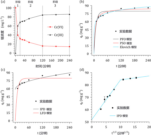 圖2:(a)六價鉻溶液和浸漬活性炭接觸時間對Cr濃度和形態(tài)的影響。(b)反應動力學模型、(c)擴散模型和(d)線性化的顆粒內擴散模型。