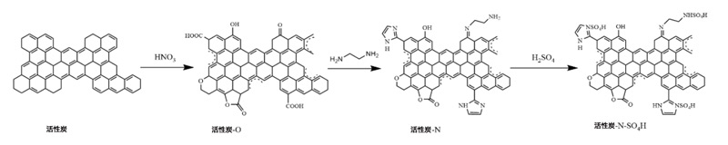 以活性炭為原料,用HNO3氧化,用乙二胺胺化。得到的中間體用硫酸水溶液處理以產(chǎn)生硫酸氫活性炭催化劑。通過過濾分離產(chǎn)物并在105℃干燥24小時。活性炭的具體制備方案如圖1所示。