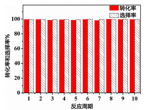 最后通過回收實(shí)驗(yàn)測試了活性炭催化劑的穩(wěn)定性,測試結(jié)果如圖3所示。在催化劑可重復(fù)使用性能的探索中,活性炭催化劑用溶劑環(huán)己烷洗滌,然后進(jìn)入下一個反應(yīng)循環(huán)。具體過程為將反應(yīng)完成后的固體離心分離出來,再用環(huán)己烷洗滌固體3次,以完全去除前一輪反應(yīng)表面殘留的少量液體。即使在連續(xù)運(yùn)行10次后,催化劑的性能也沒有顯著降低,仍然達(dá)到99%的苯甲醛轉(zhuǎn)化率和99%的選擇性。因此,活性炭催化劑是用于研究苯甲醛乙二醇縮醛反應(yīng)的優(yōu)異且穩(wěn)定的可回收固體酸催化劑。