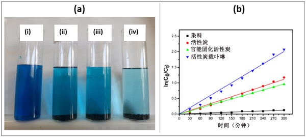 圖3:(a)過濾可見光照射5小時后MB溶液的照片。(i)單獨的MB,(ii)MB與活性炭,(iii)MB與官能團(tuán)化活性炭,和(iv)MB與活性炭載卟啉,(b)亞甲藍(lán)降解的動力學(xué)線性模擬曲線。