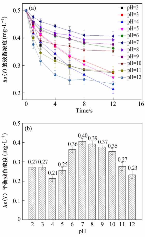 圖2:pH對As(V)電吸附的影響(a)As(V)的殘留濃度,(b)As(V)的平衡濃度。