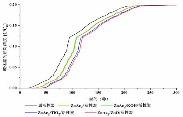 通過選擇合成吸附劑對(duì)硫化氫氣體的吸附效果產(chǎn)生了如圖3所示的吸附曲線。這些吸附曲線也與使用浸漬活性炭和原活性炭實(shí)現(xiàn)的吸附進(jìn)行了比較。我們發(fā)現(xiàn)吸附趨勢(shì)呈指數(shù)增長(zhǎng),形成S曲線。突破時(shí)間被確定為硫化氫濃度達(dá)到1ppm(突破濃度)和飽和濃度達(dá)到幾乎5000ppm的值所用的時(shí)間。與其他雙金屬活性炭吸附劑相比,ZnAc2/ZnO/活性炭吸附劑的吸附表現(xiàn)出優(yōu)異的性能。雙金屬活性炭吸附劑的合成表現(xiàn)出良好的性能,與ZnAc2/活性炭和原活性炭相比,硫化氫的吸附增加了30.2-45.8%和85.9-89.1%。因此,采用這種浸漬方法的活性炭表現(xiàn)出的高吸附增強(qiáng)了硫化氫吸附能力。