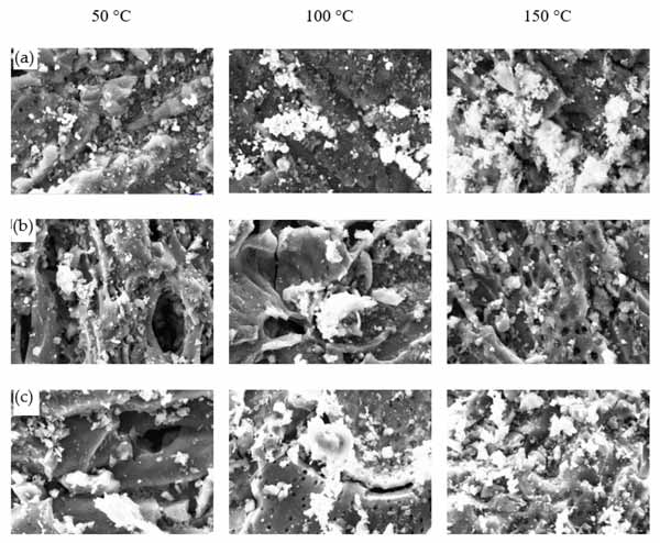 圖4:(a)ZnAc2/ZnO/活性炭、(b)ZnAc2/活性炭和(c)原活性炭吸附劑在不同解吸溫度下的2.5Kx放大倍率和2微米尺度的SEM顯微照片。