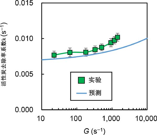 我們研究了混合強度對去除率系數(shù)(k)的影響(圖1)。我們繪制了實驗數(shù)據(jù),實線顯示了方程式預測的值。實驗結果和預測結果都表明,去除率系數(shù)隨著混合強度的增加而增加,但在G>1000s-1的范圍內,實驗結果的增加率變得更陡峭,偏離預測的速率系數(shù)值。我們假設偏差背后的急劇增加是由于活性炭顆粒在高混合強度下的分解(在給炭時輕度聚集)。這些預測是在假設活性炭顆粒的尺寸(部分聚集在原料懸浮液中)在給炭后保持不變的情況下做出的,因為原位顆粒尺寸測量是不可能的。如果這個假設是正確的,那么去除率系數(shù)隨著混合強度的急劇增加,在高G對于在給炭時已經(jīng)處于分散狀態(tài)的活性炭顆粒,不應觀察到-值范圍。為了驗證這一假設,我們使用了非聚集活性炭,其粒徑在分散處理前后沒有變化,我們在不同的混合強度。我們沒有觀察到隨著活性炭混合強度的增加,去除率系數(shù)的急劇增加,強烈表明觀察到的活性炭的急劇增加是由于高混合條件下的顆粒分解。