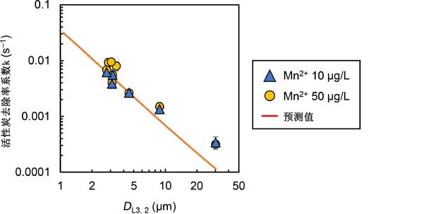 我們將Mn2+去除率系數(shù)(k)與活性炭的粒徑進行了比較(圖3)。我們使用源自相同活性炭的九種尺寸的碳顆粒繪制了實驗數(shù)據(jù),以便與方程式的預測進行比較。實驗值和預測值幾乎一致,并且在雙對數(shù)圖上都顯示出線性關系。仔細觀察發(fā)現(xiàn),預測值的斜率比實驗值更陡,在較大顆粒范圍內,實驗值略大于預測值。這可能是由于顆粒形狀或表面性質的任何差異:我們假設了一系列參數(shù)值,包括球形值,這些預測與顆粒大小無關,但在實際的活性炭中,這些值可能隨顆粒大小而變化。總體而言,活性炭的粒徑對Mn2+去除性能有很大影響。