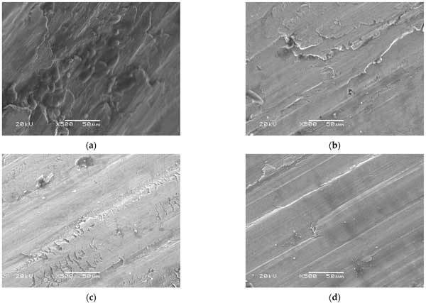 圖3:用于測試樣品的定制裝置磨痕放大500倍的SEM圖像(a)鋰基潤滑脂,(b)1wt.%活性炭,(c)2wt.%其他樣品,和(d)0.5wt.%活性炭+2wt.%其他樣品。