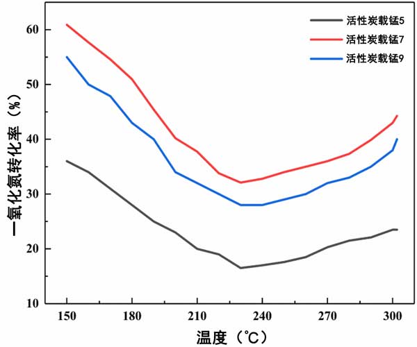 活性炭載錳催化劑在150-300℃范圍內的CO+NH3偶聯脫硝活性如圖3示;钚蕴枯d錳7催化劑在反應初期具有較高的脫硝率,高達61%;钚蕴枯d錳9催化劑僅次于活性炭載錳7催化劑,脫硝率為55%。同時,活性炭載錳5催化劑的脫硝率最低,僅為36%。隨著Mn負載量的增加,催化劑的脫硝率明顯增加。然而,當Mn負載量達到9%時,脫硝率下降。這可能是因為催化劑表面的孔隙被堵塞,孔隙塌陷,減弱NO氣體吸附。隨著溫度的升高,各催化劑的脫硝率逐漸降低,當溫度升高到230℃左右時達到最小值。這里活性炭載錳5的脫硝率下降到16.5%,活性炭載錳7的脫硝率下降到32.1%,活性炭載錳9的脫硝率下降到28%。當溫度進一步升高時,各催化劑的脫硝率逐漸升高。脫硝率順序仍然是錳含量7>9>5的活性炭催化劑。對于低溫階段的NH3-SCR反應,由于催化劑的金屬負載量有限,活性炭的吸附能力受到限制。因此,隨著NO氣體的增加,脫硝率不斷下降。對于CO-SCR反應,CO被吸附形成配位碳酸鹽,NO被吸附形成配位硝基。然后,碳酸鹽和硝基將反應生成CO和N2O。由于活性炭的吸附能力逐漸降低,脫硝率也會降低。因此,在初始溫度為230℃之前,由于兩個單獨反應的活性炭吸附能力降低,脫硝率逐漸降低。當溫度超過230℃時,NH3-SCR和CO-SCR反應由于溫度升高而促進NO轉化。由于金屬Mn是催化劑的活性物質,在其作用下,活性炭的晶格氧轉變?yōu)榛瘜W吸附氧。這促進了兩個SCR反應,催化劑的脫硝率在230℃后逐漸增加。但由于活性炭在脫硝過程中處于損失狀態(tài),NO轉化率即使逐漸上升也不會上升到初始狀態(tài)。