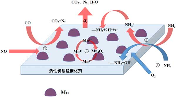 (1)CO、NH3和NO從活性炭載錳催化劑的外部連續(xù)擴散到內表面。反應氣體以吸附態(tài)吸附在催化劑表面的活性位點上,然后被活性位點活化,形成吸附態(tài)。