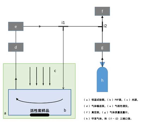 系統(tǒng)研究了活性炭復(fù)合材料的光催化性能。為了模擬實(shí)際應(yīng)用,在恒溫試驗(yàn)箱中將不銹鋼罐替換為60L聚氟乙烯袋,并保持恒溫(例如20℃)。然后,將3g活性炭微粒放在盤子上并放入袋中。入射光可以穿過PVF薄膜到達(dá)活性炭表面。其結(jié)構(gòu)如圖1所示。為了測試光催化活性,反應(yīng)器首先用泵抽真空。然后,注入60L甲苯氣體(空氣中50.0ppm)作為目標(biāo)室內(nèi)污染物。這需要大約12分鐘。之后,將反應(yīng)器在黑暗中保持0.5小時以達(dá)到吸附/脫附平衡。使用300W氙氣燈作為模擬日光源。使用氣相色譜儀定期分析反應(yīng)器中的氣體產(chǎn)物。此外,口袋中的甲苯氣體還不能完全流到氣相色譜儀的自動氣體進(jìn)樣閥,因?yàn)樵撻y的管徑比較小,輸氣泵剛剛啟動。因此,甲苯濃度低。