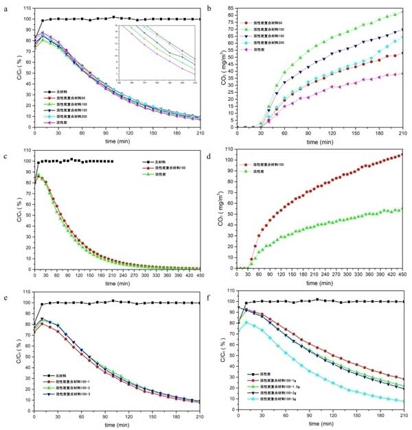 圖3:活性炭樣品去除空氣中甲苯的光催化性能(a)樣品的CO2產(chǎn)率(b)活性炭復(fù)合材料和活性炭去除甲苯的性能(c)CO2產(chǎn)率(d)三個循環(huán)的穩(wěn)定性(e)不同用量活性炭復(fù)合材料的甲苯去除效率(f)。