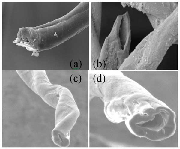 通過煅燒和HNO3、H2O2和KOH活化,廢棉纖維成功轉(zhuǎn)化為不同結(jié)構(gòu)的活性炭。圖1顯示了三種活性炭的SEM圖像?梢钥闯觯瘜W(xué)活化有助于大孔隙的形成。在整個纖維長度上可以觀察到一個空心芯,直徑約為0.5–5.0µM,形狀幾乎為圓形;钚蕴烤哂懈叨榷嗫椎慕Y(jié)構(gòu),核心直徑在大約0.5和5μM之間(圖1b,d)。這種大孔隙率可能與纖維內(nèi)壁木質(zhì)素的化學(xué)破壞有關(guān)。參考活性炭(圖1a)呈現(xiàn)大孔隙,而形態(tài)特征是纖維中芯的出現(xiàn),其直徑取決于活化劑。使用過氧化氫作為活化試劑獲得最大直徑(圖1b)。如圖1b-d所示,前體的結(jié)構(gòu)(最初具有干凈的表面)在每次化學(xué)處理后都會被破壞。有趣的是,其中一種活性炭的表面在化學(xué)活化的影響下發(fā)生明顯變化(與其他活性炭相比)。
