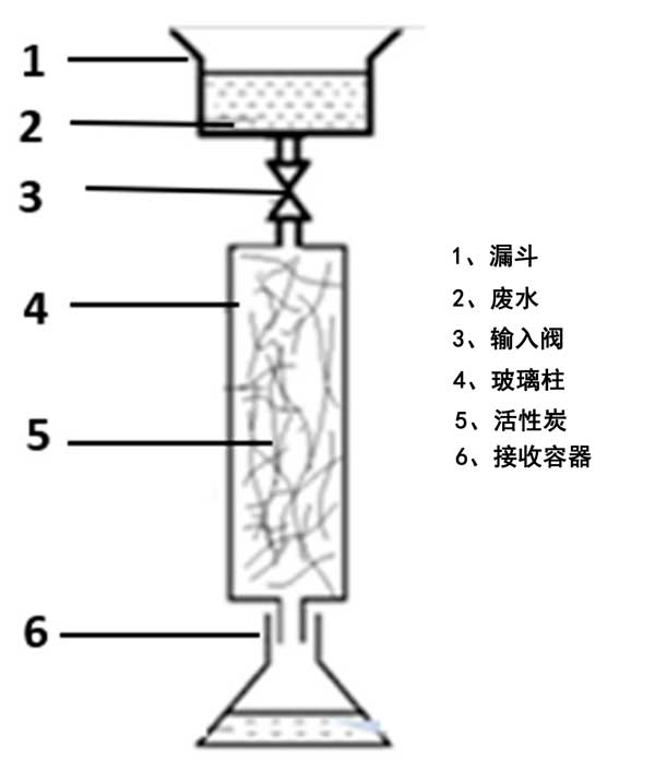 通過在密封玻璃瓶中將已知量(4.0g)的活性炭與50mL實際廢水樣品進行反應(yīng),進行批量吸附平衡實驗。測試了具有不同初始硫濃度(100、300、500、800和1000mg·L-1)的五個樣品。將瓶子在恒溫?fù)u床上放置24小時,直至達到平衡(最終pH值:10.5)。用于床吸附實驗的裝置的示意圖如圖2所示。將碳化纖維填充到玻璃柱中以研究它們的吸附能力。廢水被引入漏斗并通過輸入閥以將流量調(diào)節(jié)為4–5.10m3·h-1。首先,使用流經(jīng)柱的蒸餾水潤濕床吸附裝置以改善活性炭纖維的潤濕特性。其次,允許漏斗中的煉油廠廢水樣品內(nèi)容物通過活性炭床通過重力排放到接收容器。每小時回收處理過的水。