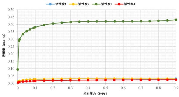 活性炭的吸附等溫線已使用氮(N2)吸附分析技術(shù)(一種標準方法)進行了研究。圖2顯示了活性炭在77K時的N2吸附等溫線,該等溫線被發(fā)現(xiàn)為I型等溫線。N2吸附在低相對壓力范圍內(nèi)的快速上升證實了所有樣品都存在小孢子,如圖2所示。很明顯,活性炭4具有最低的N2吸附,而活性炭1和活性炭2的吸附等溫線重疊,活性炭3具有最高的N2吸附。數(shù)據(jù)的這種可變性可能歸因于所使用的不同前體材料。此外,除活性炭3外,活性炭的大部分孔隙體積都填充在P/Po≈0.1以下。對于活性炭3,孔體積填充低于P/Po≈0.3。在初始增加到0.1后,等溫線逐漸彎曲,表明進一步吸附的增量較小。隨著相對壓力的增加,所有樣品的吸附幾乎呈水平狀態(tài),表明已經(jīng)達到飽和。