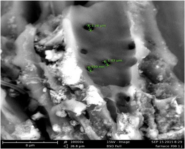 由于上述陶瓷膜去除污染物的多重優(yōu)勢和有前途的特性,分析陶瓷膜中不同活性炭和氧化鐵粉末含量的影響。使用掃描電子顯微鏡研究活性炭材料的微觀結構。圖1描繪了使用ZnCl2/50vol%在10,000倍放大倍數(shù)下活化后的活性炭的孔隙。發(fā)現(xiàn)活性炭的孔徑顯示尺寸范圍在0.93μm–1.26μm之間。
