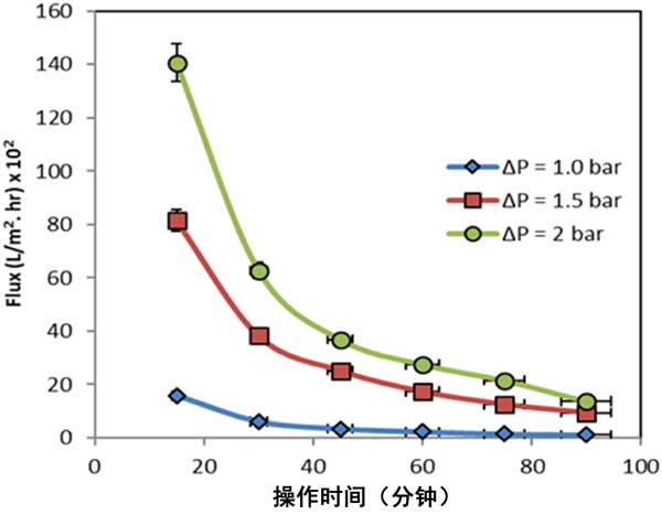 圖3顯示,在運行90分鐘后,在2bar的運行壓差下,達到的最高通量值;谶@些值,已知滲透通量值降低。發(fā)生這種情況是由于膜壁上不需要的溶解污染物顆粒堵塞,這些顆粒大于膜孔。這些顆粒堵塞膜表面的孔或卡在孔內。這種膜壁堵塞與濃差極化現(xiàn)象密切相關,在這種現(xiàn)象中,膜壁表面的污染物濃度較高,導致較低的流體流量,而通過膜的污染物最少。也可以在圖3中看到滲透通量隨著較高的操作壓力而增加,這對應于膜操作的驅動力。施加到流過膜的進料流的壓力將導致與膜孔相比顆粒尺寸更小的流體流可以通過膜,而較大的顆粒,例如污染物,將被保留。Fe、Mn、Zn、NH3–N、PO4各污染物從初始濃度1.38、1.30、0.92、0.90、0.93mg/L的總截留率分析結果分別為92.03、97.08、99.67、84.56、87.10%。這些分析結果顯示了這項工作的可喜成果,其中每項總拒絕率都在80%以上。