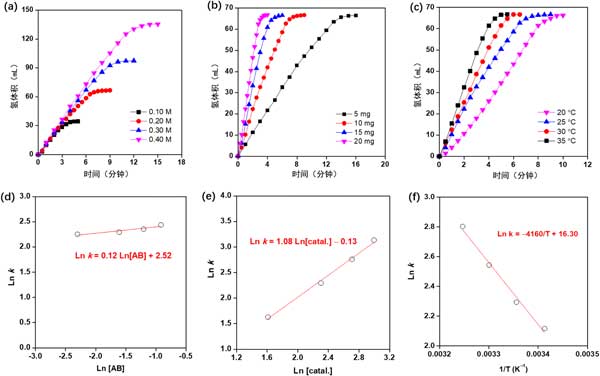 圖2:在不同的(a)氨硼烷濃度、(b)催化劑量和(c)反應(yīng)溫度下,Co0.8Cu0.2P/活性炭催化氨硼烷水解產(chǎn)生的氫氣體積與反應(yīng)時(shí)間的關(guān)系圖。(d和e)氫氣產(chǎn)生率(k)分別與氨硼烷濃度和催化劑濃度的對(duì)數(shù)圖。(f)lnk與1/T的Arrhenius圖 。
