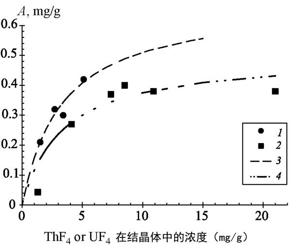 圖2:從熔體中吸附釷和鈾氟化物的等溫線。(1,2)實驗數(shù)據(jù);(3,4)根據(jù)Langmuir方程逼近實驗點。(1,3)四氟化鈾;(2,4)THF4。