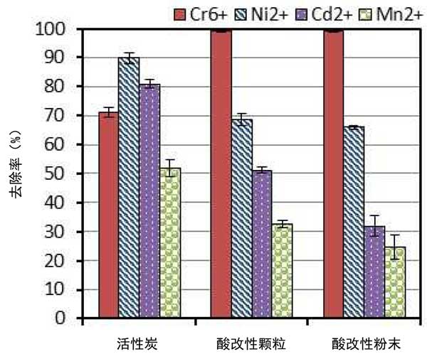 顆;钚蕴康乃崽幚砼c未處理的活性炭相比,Cr6+去除效率提高了30%,而Ni2+、Mn2+和Cd2+分別降低了23%、36%和37%。這可以通過與其他離子相比更高的離子勢和Cr6+的小尺寸來解釋。這將導(dǎo)致Cr6+對酸性表面基團的吸引力更強,并更快地擴散到活性炭的孔隙中。高正電的Cr6+離子會吸附在孔隙邊緣的酸性功能位點上,排斥其他較弱的重金屬離子,降低它們對活性炭孔隙的可及性。