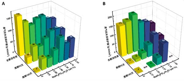 用磷酸三鈉12水合物(Na3PO4·12H2O)在活性炭上進行類似的實驗,活性炭失活后干燥。實驗在11.03wt.%的濃度下進行,相當于4.00wt.%的NaH2PO4·H2O的摩爾當量。很明顯,磷酸三鈉在抑制衰老方面并不有效。經(jīng)過3個月的加速失活,保護值甚至低于未改性的活性炭。然而,Na3PO4·12H2的效率可能會降低如果在酸性環(huán)境中或與酸或酸性化合物一起添加,效果會更好。這是因為酸性條件可以向磷酸鹽提供質(zhì)子,導致磷酸鈉有效地充當Na2HPO4或NaH2PO4?傮w而言,結(jié)果表明,在由磷酸及其三種鈉鹽組成的磷酸鹽添加劑中,一元鹽NaH2PO4·H2O是抑制失活最有效的添加劑。