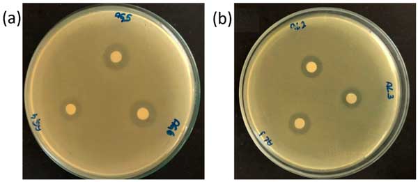 圖2:通過紙片擴散對(a)水基大蒜提取物,16±1.3mm和(b)乙醇基大蒜提取物,14±1.0mm進行抗菌敏感性測試(從10次重復(fù)獲得的平均值和標(biāo)準(zhǔn)偏差值)。