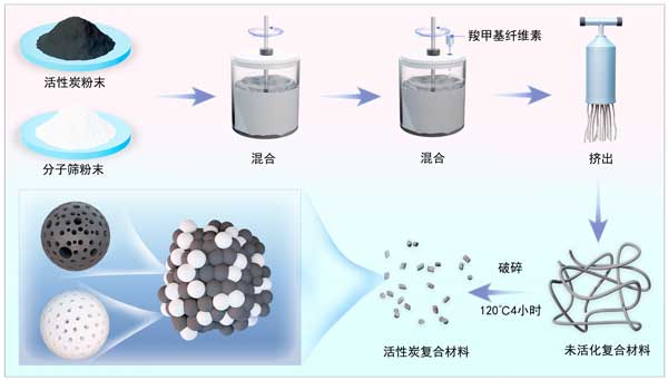 活性炭之所以特別適合用于吸附過程,是因?yàn)樗哂懈叨榷嗫椎臒o定形結(jié)構(gòu),能夠吸附各種分子。它具有微孔和中孔,可以容納各種大小的分子,補(bǔ)充了分子篩的孔隙特異性;钚蕴窟具有利用功能基團(tuán)改變其表面化學(xué)性質(zhì)的潛力,從而增強(qiáng)其與目標(biāo)分子的相互作用。本文以羧甲基纖維素為黏合劑,通過機(jī)械混合和擠出法制備了一系列 華活性炭分子篩復(fù)合材料(圖1)。