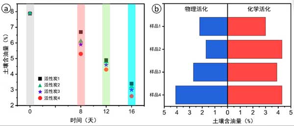 圖2a為污染土壤中油含量的值。土壤初始石油烴污染度為79.2g/kg或7.9wt.%。將活性炭樣品應用于石油污染土壤后,油含量逐漸降低。第8天添加活性炭的土壤樣品油含量為5.7-6.7%,第16天為2.6-3.3%。根據(jù)土壤樣品中的油含量計算出土壤凈化度,添加吸附劑的土壤16天后的土壤凈化度為58.2-67.1%。試驗表明,活性炭樣品對土壤表現(xiàn)出較高的凈化效果。16天后,石油污染土壤的凈化度可達67.71%。