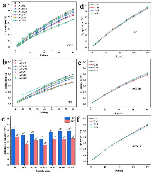氫氣儲存材料在實際應(yīng)用中需要具備良好的循環(huán)性能。作者對AC、ACM10、ACN10等樣本進行了若干次(例如10次或更多)吸附–解吸循環(huán)測試,以評估其穩(wěn)定性。原文圖2d、5e、5f展示了循環(huán)曲線。