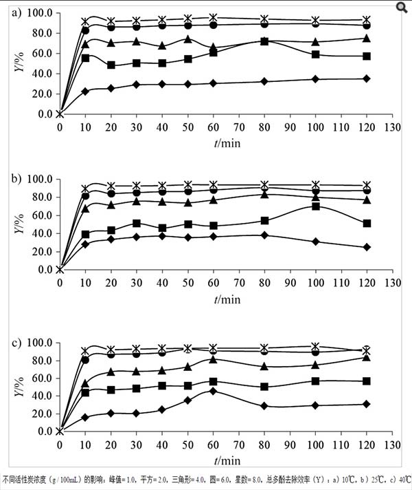 所用活性炭的濃度是控制吸附的重要因素。眾所周知,溫度是影響任何吸附過程的附加因素。因此,在三個不同的溫度,室溫(25℃),高于(40℃)和波紋管(10℃)下進(jìn)行測試。為了觀察溫度和吸附劑量對多酚吸附的同時影響,吸附劑濃度從1至8g / 100mL變化。使用相同數(shù)量的廢水(25mL)和恒定的酚濃度(3.0mg / mL)進(jìn)行不同的測試,但改變活性炭的量(0.25、0.5、1.0、1.5和2.0g)。在圖中可以觀察到不同溫度下的吸附趨勢。