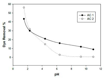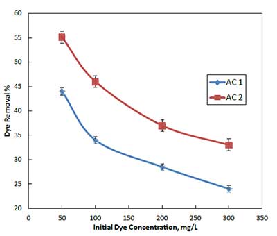 初始染料濃度在50〜300 mg L -1檸檬黃對AC1和AC2吸附效率的影響,結(jié)果如圖2所示。從圖中可以看出,隨著酒石黃初始濃度的增加,酒石黃脫除百分比降低。雖然吸附百分比隨初始染料濃度的增加而降低,但每單位質(zhì)量吸附劑吸附染料的實(shí)際量隨著試驗(yàn)溶液中染料濃度的增加而增加。為AC1的單元吸附從10.85增加MGG -1至35.70 MGG -1作為供試品溶液的酒石黃濃度從50 MGL增加-1至300 MGL -1。類似大號 Y,對AC2單元吸附從14.05增加MGG -1至50.1 MGG -1作為染料濃度從50 MGL增加-1至300 MGL -1。