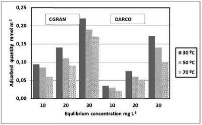 關(guān)于活性炭對(duì)松香酸的吸附能力,圖1a顯示CGRAN活性炭的吸附容量隨著平衡濃度的增加而增加。相反,圖1b顯示,DARCO的吸附能力在平衡濃度高達(dá)30 mg L -1時(shí)稍微增加,然后在所有三個(gè)溫度下的病房后急劇增加。與DARCO相比,所接收的活性炭的結(jié)果顯示對(duì)CGRAN具有較高的吸附容量,這可歸因于較高表面積和較大量的存在于前者的氧官能團(tuán)的組合。