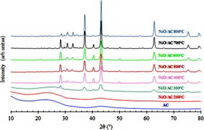 由活性炭和活性炭負(fù)載的鎳在不同的熱處理溫度下記錄的X射線衍射圖如圖1 所示。在200中被加熱的樣品 ℃,在2θ顯示有2個(gè)衍射峰 = 23.5和43.5°,對(duì)應(yīng)于(0 0 2),(1 0 無(wú)定形活性炭0)指數(shù)平面。另外,隨著煅燒溫度從300 ℃ 升高到800 ℃ ,反射次數(shù)增加,表明添加的催化劑在2θ = 37.1°,43.2°,62.7°和75.3° 處被氧化成氧化鎳 。這些角度分配給(1 1 1),(2 0 0),(2 2 0)和(3 1 1)面,立方晶體的氧化鎳。此外,對(duì)于400-800 ℃ 煅燒的樣品,在對(duì)應(yīng)于(2 2 2)的2θ = 79.3° 處觀察到新的峰。氧化鎳峰的強(qiáng)度也隨著煅燒溫度的增加而增加。