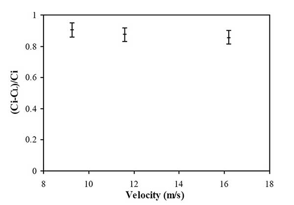 旋風(fēng)分離器系統(tǒng)對應(yīng)于具有強大的慣性力場的移動床粒子。雖然活性炭尺寸和流速兩個參數(shù)在吸附過程中都起著關(guān)鍵作用,但顆粒尺寸有更明顯的趨勢;趧×业耐牧,高流速形成更好的混合條件,但使吸附劑顆粒的停留時間極短,這可能降低與旋風(fēng)分離器內(nèi)的目標(biāo)氣體流動的接觸概率。例如,350升/分鐘(1pm)的流速導(dǎo)致16.2米/秒的入口速度,從而導(dǎo)致在旋風(fēng)分離器的混合室內(nèi)停留時間大約為0.14秒。因此,為了有效利用活性炭顆粒直至完全吸附,顆粒應(yīng)盡可能多次重復(fù)使用。