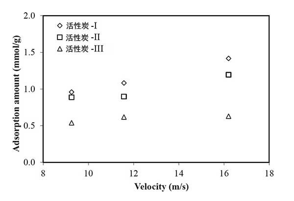 間歇填充床試驗中,活性炭對于甲苯蒸氣的吸附容量,即最大容許吸附量,從各種尺寸的活性炭的等溫實驗中發(fā)現(xiàn)為0.01-0.03mol / g。第一次施加到以16.2米/秒運行的旋風(fēng)分離器的新鮮吸附劑的吸附量對于活性炭-I是1.4mmol / g,對于活性炭-II是1.2mol / g和對于活性炭-III,如圖2所示。它僅僅小于活性炭吸附劑潛在容量的1/10。該旋風(fēng)分離器中甲苯的吸附量與交流流化床反應(yīng)器的體積(3.3〜5.4mmol / g 活性炭)相當(dāng)競爭。至于尺寸效應(yīng),小顆粒提供大單位體積的表面積,這可以呈現(xiàn)更多潛在的吸附位點。對于活性炭-I、II、III,各尺寸范圍的面積分別為1145,1034和912m2/ g。