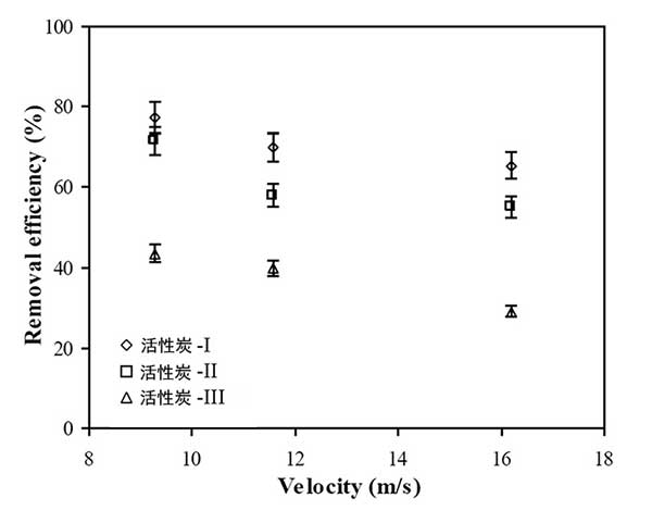 流速同時影響氣體吸附和活性炭回收,因為它涉及氣體和活性炭顆粒的混合程度、。圖3在各種活性炭吸附劑尺寸下,氣體去除效率和流量之間呈現(xiàn)出輕微的反比關(guān)系。最小的吸附劑(活性炭-1)以9.26米/秒除去77.4%的甲苯蒸氣,然后以16.2米/秒降至65.4%。微粒活性炭吸附劑捕獲沿著旋風(fēng)分離器的流動路徑行進的甲苯蒸氣。雖然在前面的的內(nèi)容說過吸附量以高速增加,但是氣體去除效率相當(dāng)?shù)。這是因為在高流量下甲苯的絕對體積要高得多。因此,即使活性炭吸附得更多,更多的氣體分子傾向于流出而沒有在內(nèi)部吸收。因此,關(guān)于顆粒回收和氣體去除效率的最佳流量必須通過在各種操作條件下的眾多實驗來確定。
