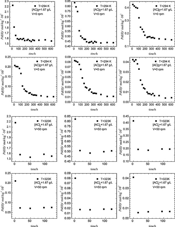 圖1:氯化鈀復(fù)合離子初始濃度的初始濃度對(duì)活性炭吸附影響。實(shí)驗(yàn)條件:pH1,Cl-=0.1mol·kg-1。
